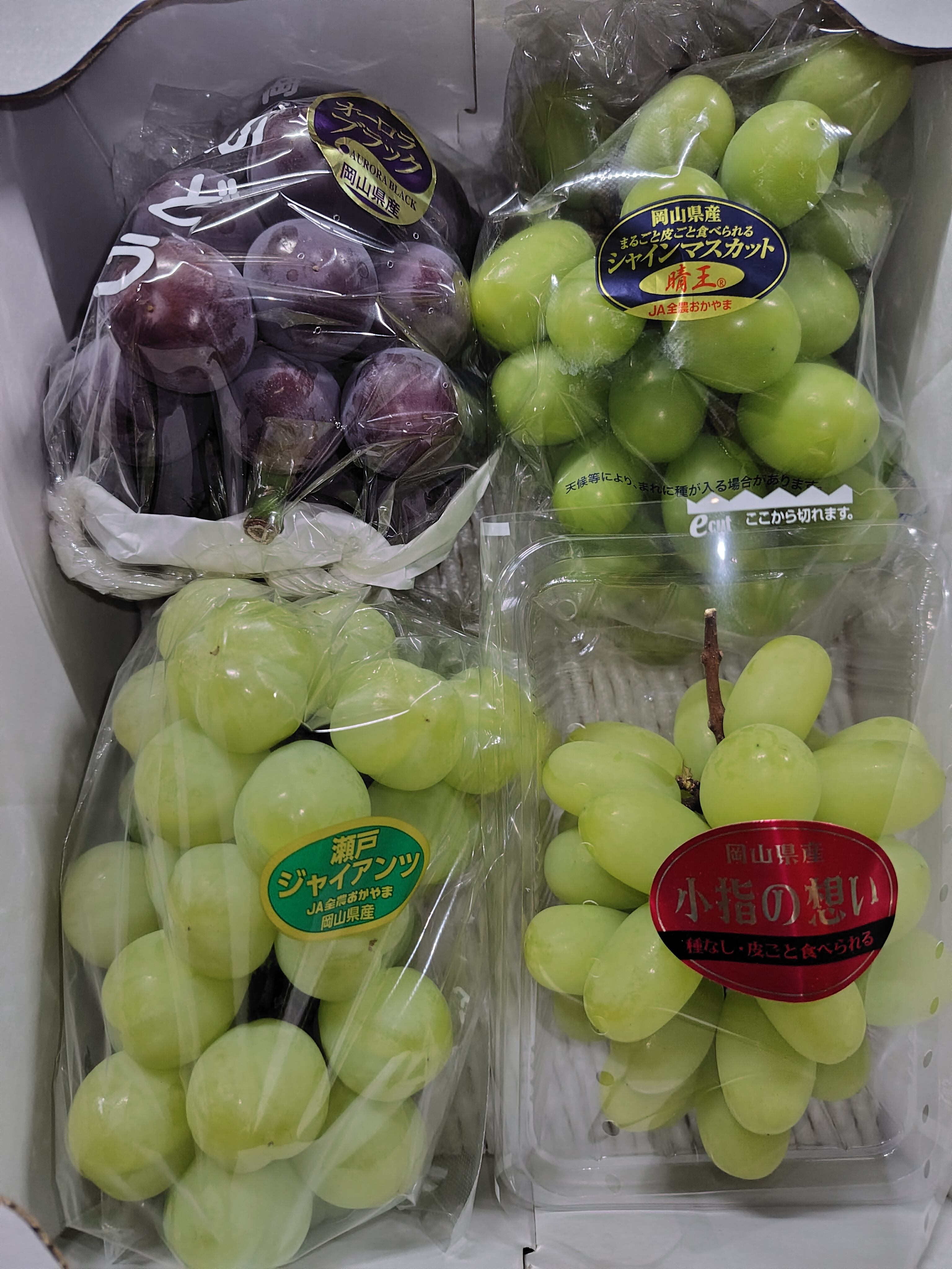 シャインマスカット、瀬戸ジャイアンツ、小指の思い、オーロラブラックの4房